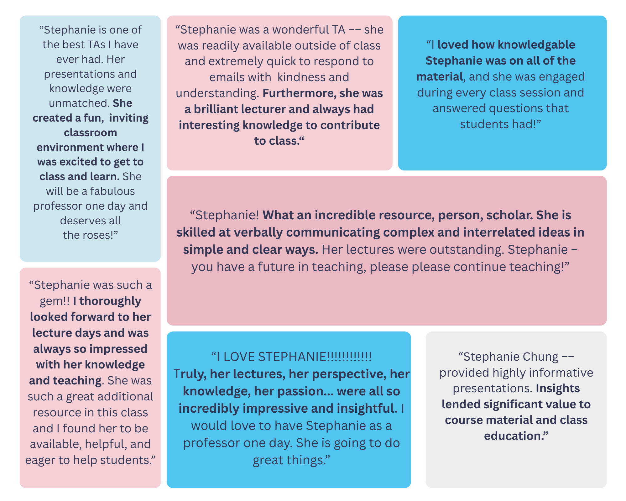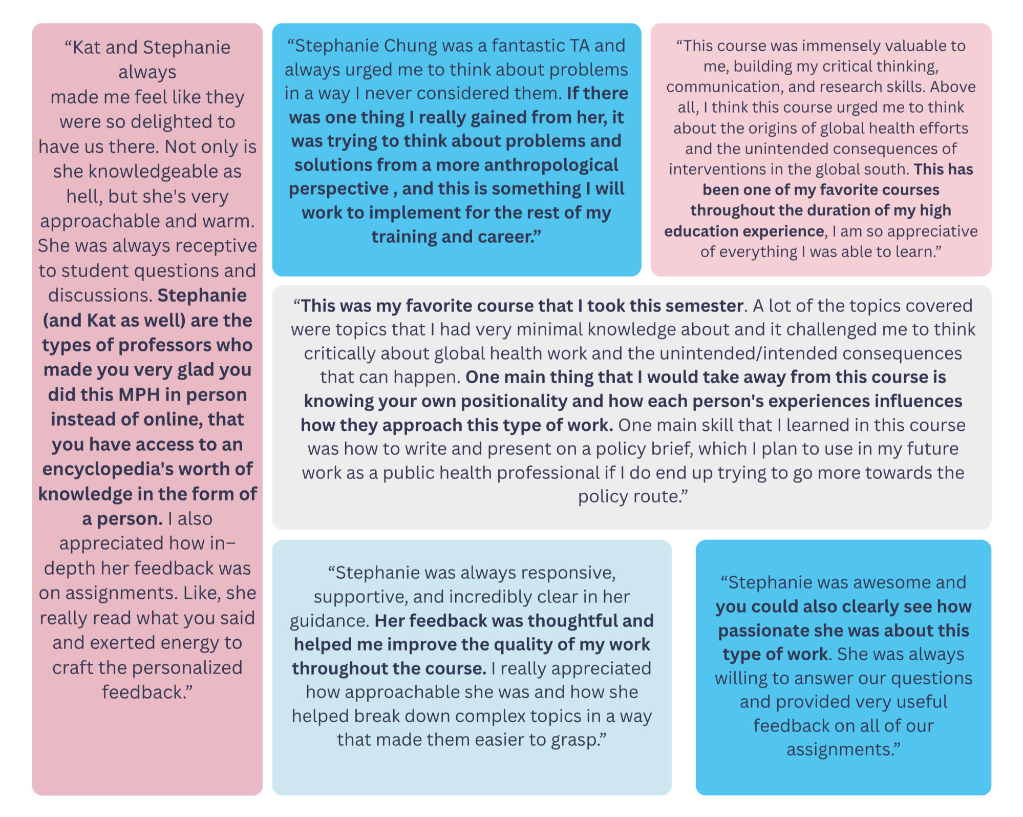 I can't emphasize enough how much I love teaching. Currently, I co-teach a course at UNC title "Power to the People: Delivering High Quality Healthcare in the Global South" in the Spring, and guest lecture in several classes across three universities. Here is some of what my students have to say about my teaching!Do you want a copy of my syllabi or to invite me to guest lecture? Use the contact me form!